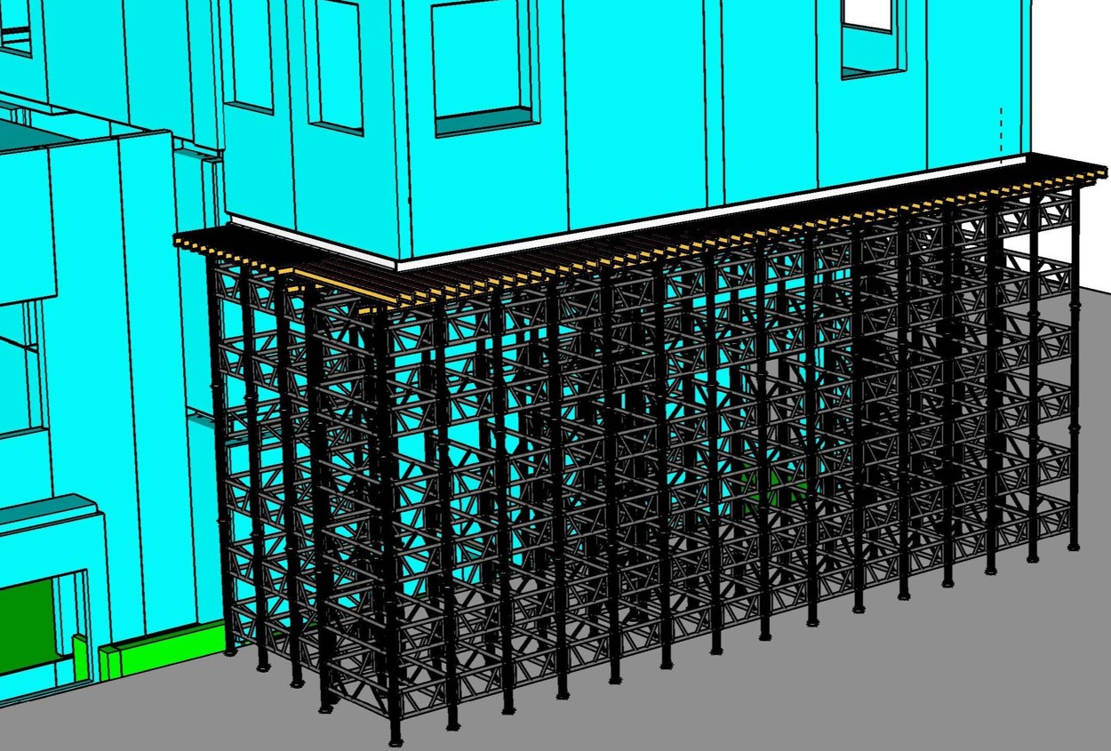 En af udfordringerne ved store udkragninger rent byggeteknisk er, at de skal understøttes i byggeperioden, eller i hvert fald længe nok til, at den berørte del af bygningen bliver selvbærende. DM Supply, der bl.a. leverer understøtninger til betonelementbyggerier, var tidligt inde i byggeriet med forslag til, hvordan udfordringerne med understøtningen kunne løses.