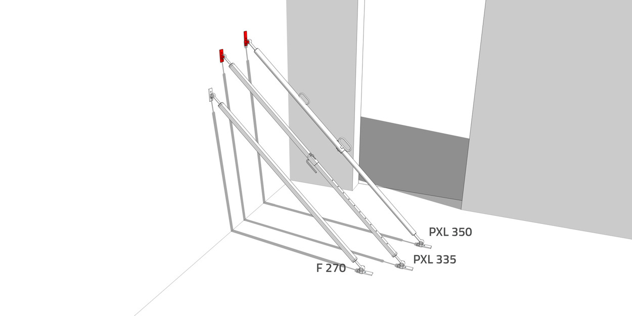 PXL 350 er en varmforzinket elementstøtte beregnet til afstivning af etagehøje lange betonvægelementer under montagen. Egenvægten er lille i forhold til den till. belastning. PXL 350 er teleskoperbar og har i begge ender spindelstykker med skjult gevind til finjustering med en samlet vandring på 180 mm.