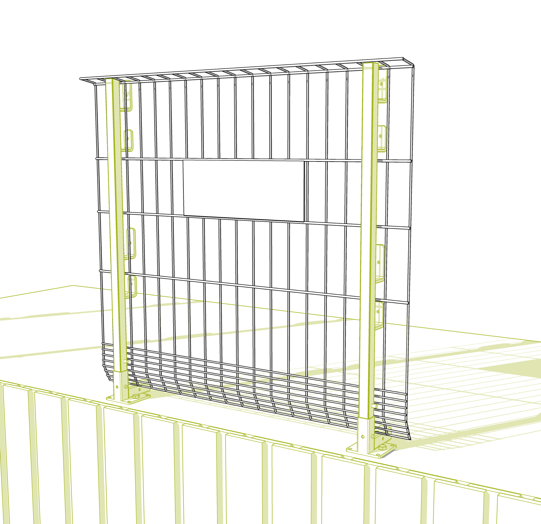 Sikkerhedshegn 115 (kort) er et kompakt, varmforzinket hegn med indbygget fodliste. Monteres hurtigt på stolper og bruges, hvor standardhegn er for langt – f.eks. ved altaner. Kan leveres pulverlakeret og løftes under armeringsarbejde.