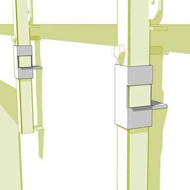 De 2 dobbelte gaffelbøjler bruges som holdere for gelænder af enten planker 30 x 120 mm, 45 x 95 mm reglar eller PROTECTO-hegn. Låsestiften sikrer gelænderstolpenved montage.