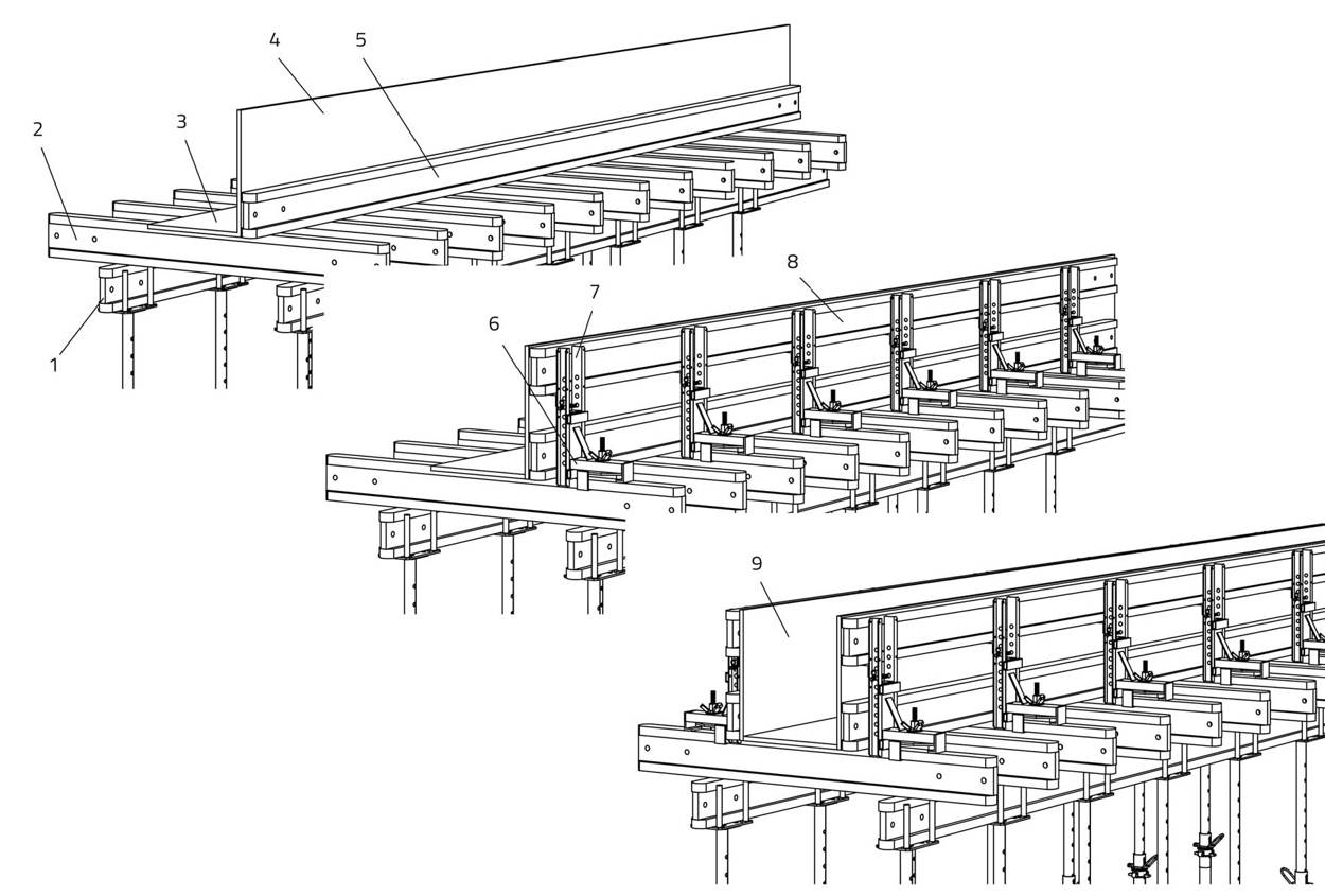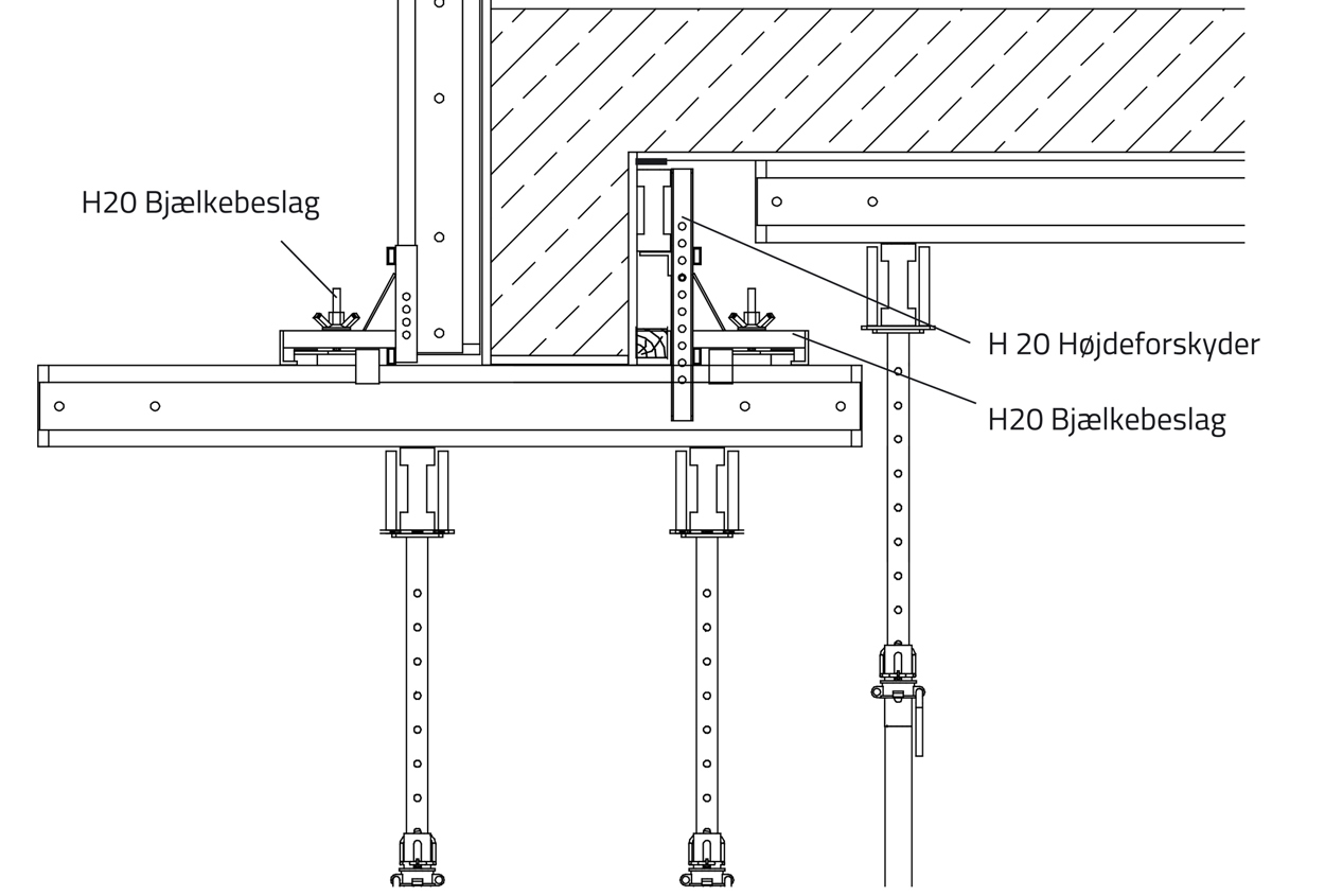 Strøretning parallel med bjælken: H20 drageren, der støtter bjælkens sideforskalling, placeres med H 20 Højde-forskyder således, at den samtidig understøtter fineren til dækforskallingen.
